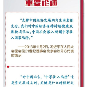 “对中国而言,‘中等收入陷阱’过是肯定要过去的,关键是什么时候迈过去、迈过去以后如何更好向前发展。”2014年11月10日,习近平总书记在出席亚太经合组织领导人同工商咨询理事会代表对话会时表示,有信心在改革发展稳定之间以及稳增长、调结构、惠民生、促改革之间找到平衡点,使中国经济行稳致远。