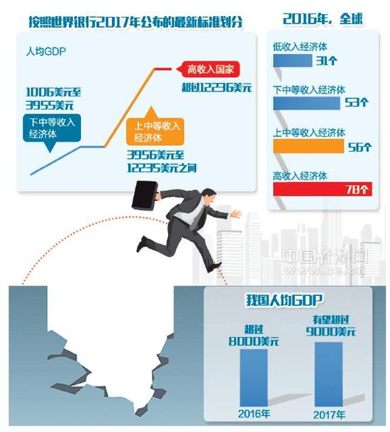 “我国人均GDP在2016年超过8000美元,2017年预计将逾9000美元。从全球看,我国已属于上中等收入经济体的中间水平。”国务院发展研究中心研究员许召元表示,尽管离1.2万美元的高收入标准已经很近了,但剩下这段差距非常关键。如果保持6%左右的年均增长速度,在不考虑汇率升值和标准变化的情况下,再经过几年发展,我国有可能进入高收入经济体行列。
