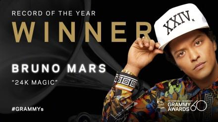 在第60届格莱美奖颁奖典礼中,布鲁诺的《24K Magic》获得年度专辑、年度制作、最佳R&B专辑、最佳非古典工程专辑四项大奖,单曲《That’s What I Like》则收获年度单曲和最佳R&B歌曲两奖,布鲁诺还凭借此曲获得最佳R&B歌手,七项提名全中,消息一出,不少网友称,火星哥已成为格莱美的新宠儿。还有人调侃,前两年年度专辑分别是《1989》和《25》,今年是则《24K Magic》,看来格莱美偏好数字打头的专辑。