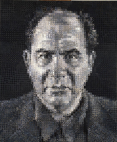 美国当代艺术家查克·克洛斯(Chuck Close)在1988年因脊髓动脉塌陷而下肢瘫痪后,开始运用新的绘画方式。克洛斯本人不但是画家,还是一位精良的摄影师。他为美国雕塑家乔夏·皮罗(Joel Schapiro)画像是其代表作之一。创作时,他先为皮罗拍下一张巨型一次成像照片。接着,他在画布和照片上布上方格,一格一格地将照片复制到画布上。克洛斯用圆圈填满每一格,每格皆不相同;从远处看,画像仿佛是打上马赛克的照片。