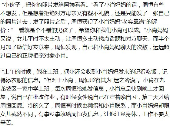 在对方妈妈的安慰下,周恒只好硬着头皮跟小肖继续保持着联系,但每天也仅仅限于问安,说多了,小肖便说自己犯困,要早点睡了。小肖妈妈又问自己和女儿相处的任何细节,周恒真心觉得自己太难回答。