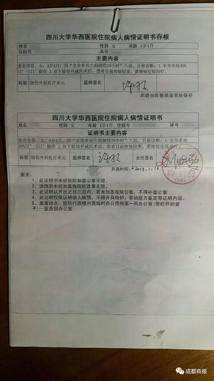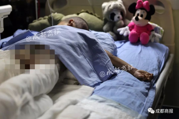 “当时彤彤感冒了躺在沙发上睡觉,外公去幼儿园接大女儿放学,来回20分钟左右,没想到就发生了意外。”李女士说,接由于彤彤的伤情太严重,芦山县以及雅安市当地医院都无法救治,立即转到华西医院救治。在医院看到小女儿的那一刻,她傻眼了。