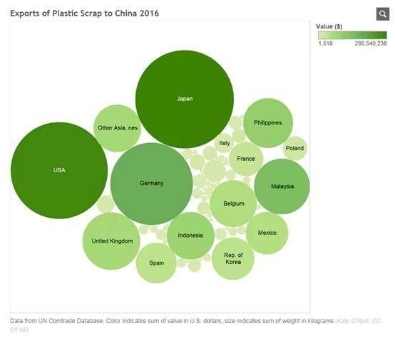 在这个令业界震惊的禁令之前,中国是世界上主要的废品进口国。 2016年进口废塑料730万吨,价值37亿美元,占世界进口量的56%。