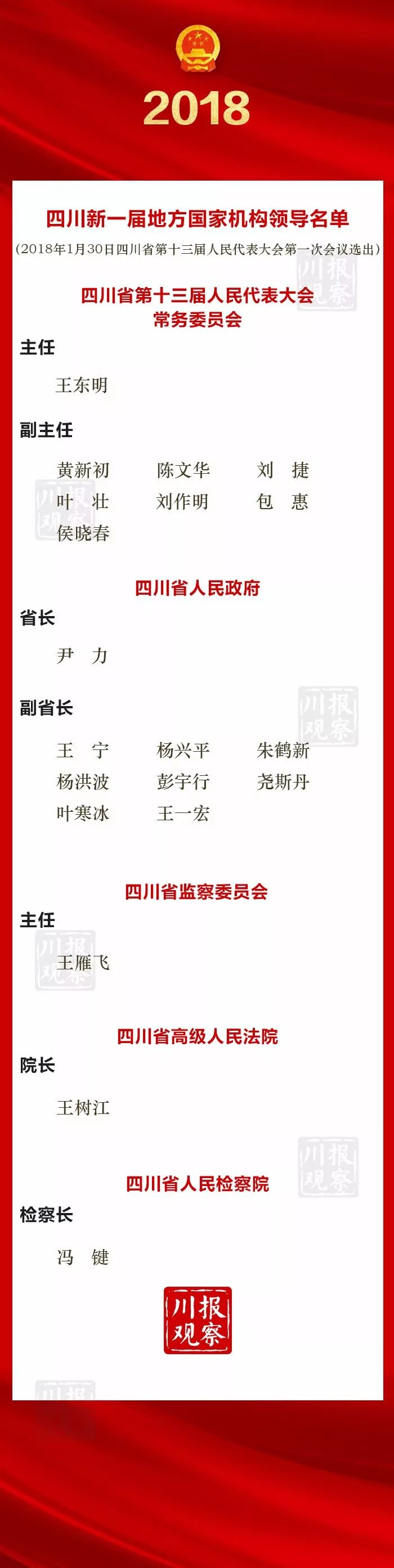 在1月30日上午举行的四川省十三届人大一次会议第三次全体会议上,王东明当选为四川省十三届人大常委会主任。黄新初、陈文华、刘捷、叶壮、刘作明、包惠、侯晓春当选为四川省十三届人大常委会副主任。
