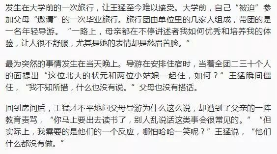 如果仅从王猛所写的长文来判断,他的父母算是比较强势,管得也比较多的。但如果放在“中国式父母”这个群体里去衡量,这对父母的表现顶多也就居于中上位置,远没有突破“正常”的范畴。