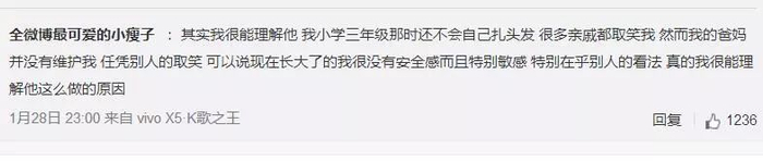 “其实我很能理解他,我小学三年级那时还不会自己扎头发,很多亲戚都取笑我,然而我的爸妈并没有维护我,任凭别人的取消,可以说现在长大了的我很没有安全感而且特别敏感,特别在乎别人的看法,真的很能理解他这么做的原因。”