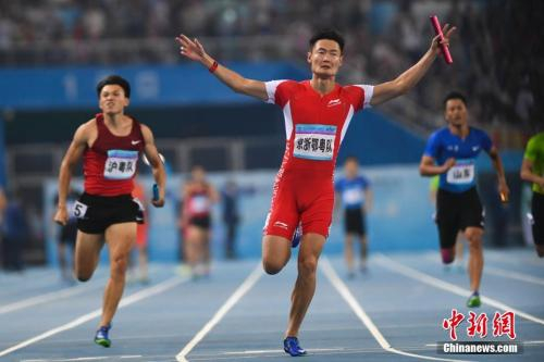 资料图:天津全运会男子4×100米接力决赛,吴智强、谢震业、苏炳添、张培萌以38秒16的成绩夺得冠军。图为张培萌撞线庆祝。 中新社记者 武俊杰 摄