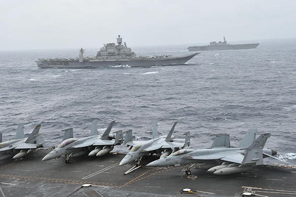 美国提出“印太”战略的目的,明显是要将印度拖入美国的亚太军事阵营。图为2017年7月,日美印三国18艘舰船等参加马拉巴尔军事演习。 视觉中国 图