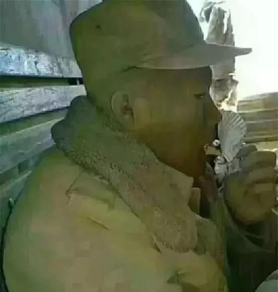一名战士训练回来后满脸灰尘,在返回的路上补充干粮。既看不出他的军衔,也看不清他的容貌……