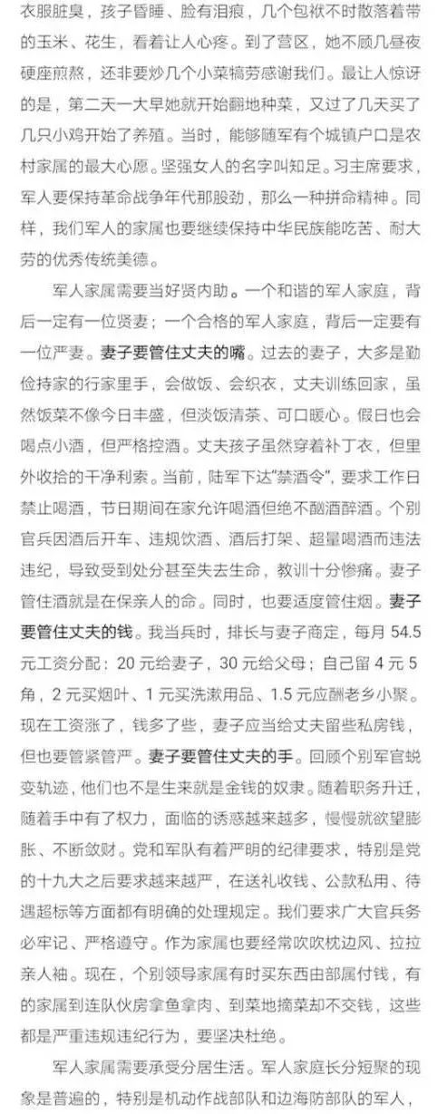 军人家属需要当好贤内助。一个和谐的军人家庭,背后一定有一位贤妻;一个合格的军人家庭,背后一定要有一位严妻。妻子要管住丈夫的嘴。过去的妻子,大多是勤俭持家的行家里手,会做饭、会织衣,丈夫训练回家,虽然饭菜不像今日丰盛,但淡饭清茶、可口暖心。假日也会喝点小酒,但严格控酒。丈夫孩子虽然穿着补丁衣,但里外收拾的干净利索。当前,陆军下达“禁酒令”,要求工作日禁止喝酒,节日期间在家允许喝酒但绝不酗酒醉酒。个别官兵因酒后开车、违规饮酒、酒后打架、超量喝酒而违法违纪,导致受到处分甚至失去生命,教训十分惨痛。妻子管住酒就是在保亲人的命。同时,也要适度管住烟。妻子要管住丈夫的钱。我当兵时,排长与妻子商定,每月54.5元工资分配:20元给妻子,30元给父母;自己留4元5角,2元买烟叶、1元买洗漱用品、1.5元应酬老乡小聚。现在工资涨了,钱多了些,妻子应当给丈夫留些私房钱,但也要管紧管严。妻子要管住丈夫的手。回顾个别军官蜕变轨迹,他们也不是生来就是金钱的奴隶。随着职务升迁,随着手中有了权力,面临的诱惑越来越多,慢慢就欲望膨胀、不断敛财。党和军队有着严明的纪律要求,特别是党的十九大之后要求越来越严,在送礼收钱、公款私用、待遇超标等方面都有明确的处理规定。我们要求广大官兵务必牢记、严格遵守。作为家属也要经常吹吹枕边风、拉拉亲人袖。现在,个别领导家属有时买东西由部属付钱,有的家属到连队伙房拿鱼拿肉、到菜地摘菜却不交钱,这些都是严重违规违纪行为,要坚决杜绝。