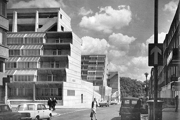 在此过程中,我采访了两位建筑师。其中一位是David Levitt,这位毕业于剑桥大学的著名建筑师在布伦瑞克中心居住多年。他大学毕业后的第一份工作就是作为布伦瑞克的建筑设计师Patrick Hodgkinson的助理,虽然当时他没有工作到项目完成,但在多年以后,中心翻修的时候,是由他的事务所负责的。Levitt在他上过多本设计杂志的公寓里,细致地向我讲述了当年布伦瑞克在设计建造时遇到的种种问题,简单来说,原设计师霍奇金森的理念是使用红色砖块,并且用“皇冠奶油”色粉刷建筑表面,以参照伦敦摄政大楼的平台设计,然而,由于预算缩减,砖块变成了混凝土,而混凝土也没有被粉刷。原色混凝土很快就老化了,令建筑看上去像是破败的福利大楼。不过,也正是由于这个特性,布伦瑞克中心被公众普遍认为是“粗野主义”的代表,在这一美学风格重新引领潮流的今天,成为了喜闻乐见的所在。