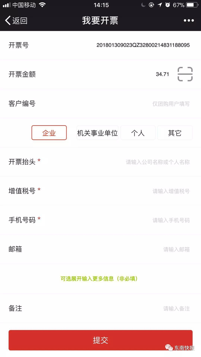 消费者根据实际情况填写开票信息,填写完毕,点击“提交”,即可生成电子发票。