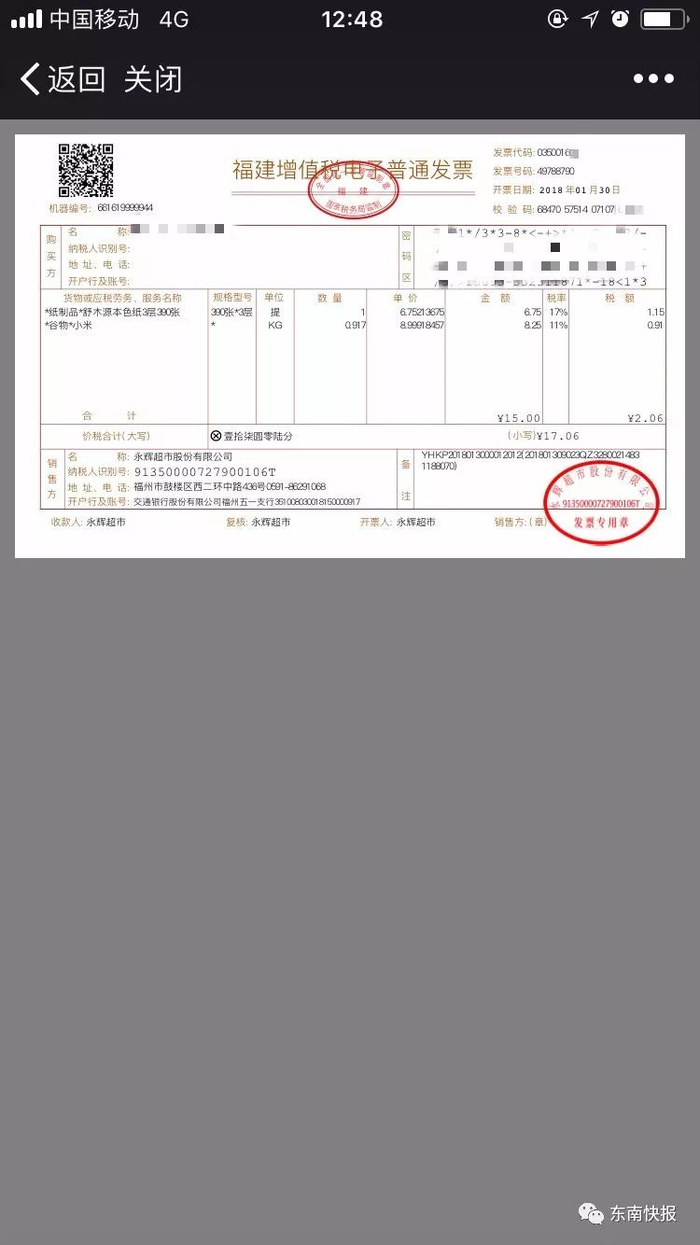 4用A4纸打印电子发票福州市国税局相关人士表示,手机里的电子发票只要用普通A4纸打印出来就可以作为报销凭证,而且相关发票信息在永辉超市APP或者51发票网站上仍有存档,消费者可按需调取。