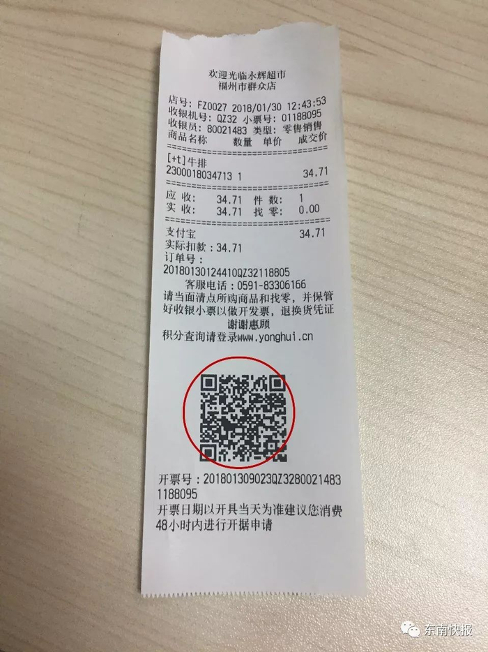 最近,细心的消费者可能会发现,永辉超市出具的购物小票下方多出了一个二维码,用手机扫这个二维码,便可以在手机上完成开票操作。