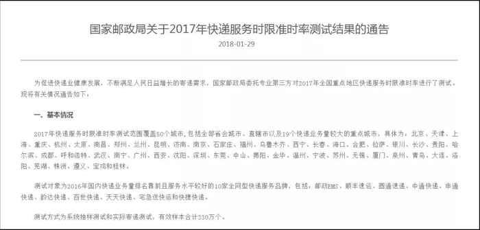 1月29日,国家邮政局发布两则通告,介绍2017年快递服务满意度调查情况和时限准时率测试情况。