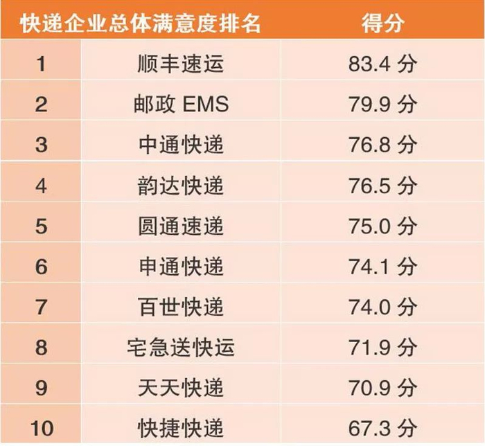 对广大用户而言,最关注的当属快递企业排行榜。此次排行榜中,总体满意度排在前三的分别是顺丰速运(83.4分)、邮政EMS(79.9分)、中通快递(76.8分),紧随其后的是韵达、圆通、申通、百世、宅急送、天天以及快捷快递,其中韵达快递和百世快递的总体满意度上升较为明显。