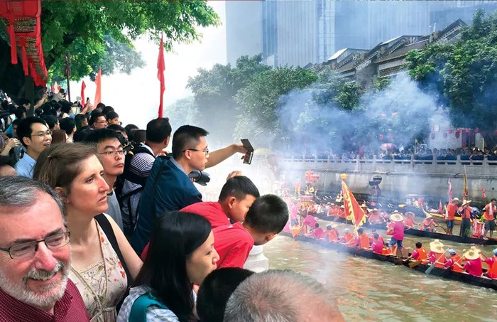 猎德村端午龙舟招景活动气氛热烈,吸引了不少外国游客前来观看。(资料图片) 广州日报记者 莫伟浓 摄