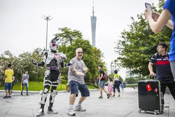 在珠江新城,一位大学生在cosplay“假面骑士”,吸引外国游客要求与其合影。(资料图片) 广州日报全媒体记者 陈忧子 摄
