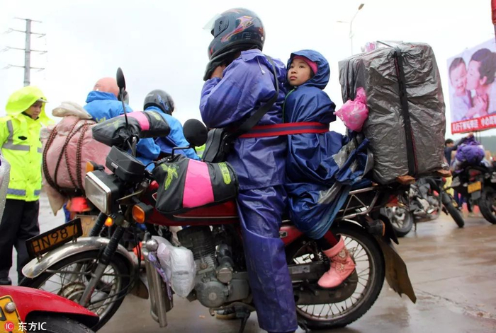 ▲ 2017年1月13日,在粤桂交界的广西梧州市藤县路段,姐姐小郭“绑”在父亲腰间,随家人骑摩托车长途跋涉,从广东江门市乘“铁骑”赶回广西平南县老家过年,单程跋涉400多公里。 (图|东方IC)