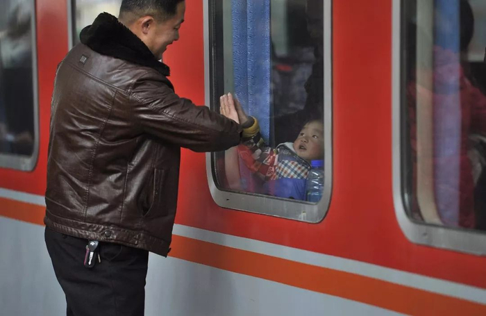 ▲ 2017年2月7日,合肥火车站站台,合肥开往东莞东列车边,一名男子和年幼的孩子将手贴在玻璃上告别。