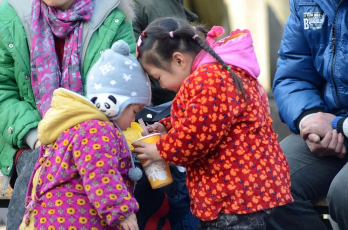 ▲ 2012年01月14日,北京西客站,小姐姐拿着水给妹妹喝。(图|视觉中国)