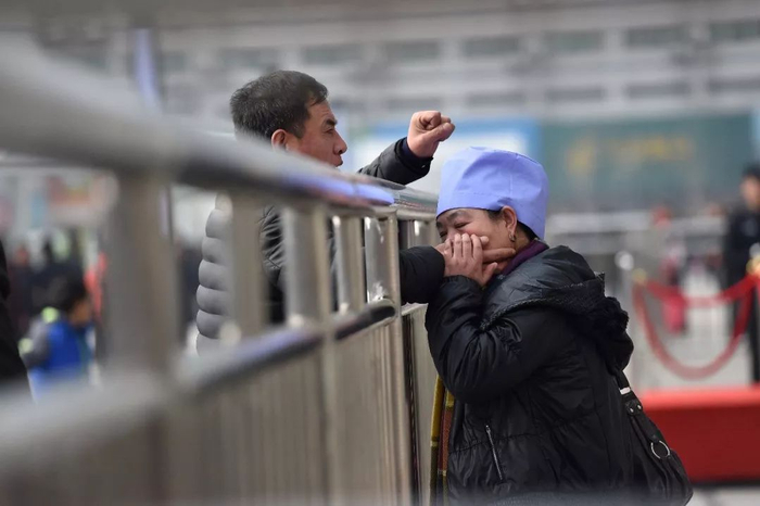 ▲ 2017年2月7日,合肥丈夫妥仁勤送妻子到火车站。合肥到宁夏老家有几十个小时车程,而这一别可能又要到下一个春节,才能见面。妥仁勤不敢看妻子的眼神,害怕自己的眼泪流下来。突然,妻子将他的手拿到自己的脸上,紧紧地贴着。(图|视觉中国)