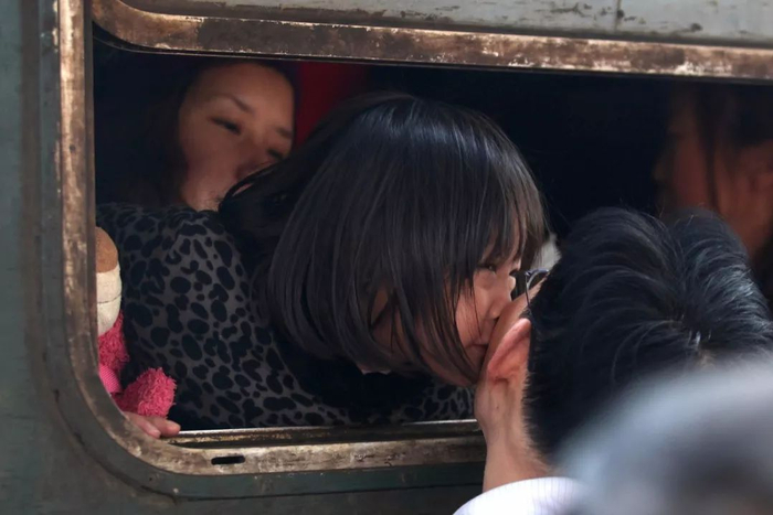 ▲ 2011年1月15日,深圳火车西站,一小女孩探头亲吻站在月台上的父亲,父亲因为工作原因要晚几天才回家。(图|视觉中国)