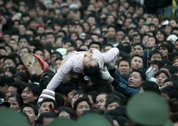 ▲ 2008年1月31日,广州。大批乘客聚集在火车站广场外准备进站。一乘客晕倒在人群中,乘客把其抬高救出。(图|视觉中国)