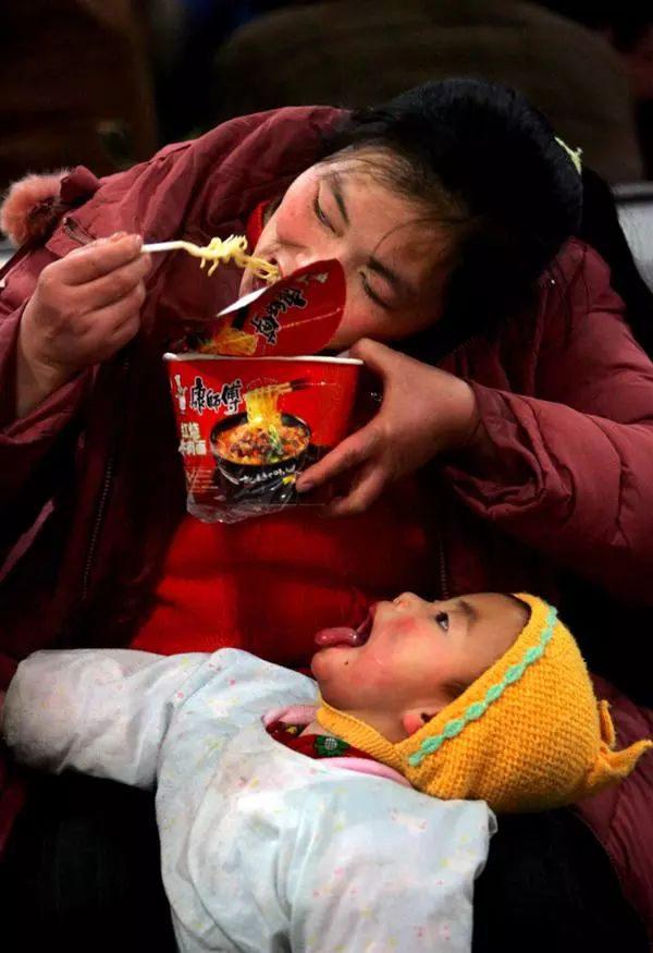 ▲ 2006年1月18日,西客站候车室,一位母亲为了喂年幼的孩子把方便面咬成一小截,孩子却等不及地张大了嘴巴。(图|视觉中国)
