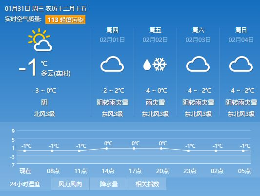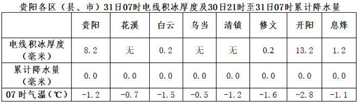 1月31日早上7时,贵阳市气象局发布消息,目前,全市阴天,大部分地区气温-3至-1℃。预计今天早上到中午,阴天为主,地势高处路段、桥梁和隧道口仍有道路结冰维持,气温-2~1℃。