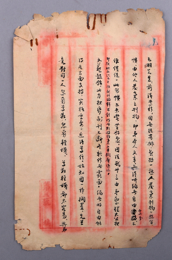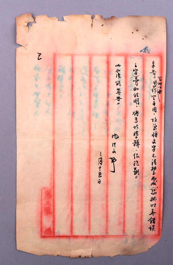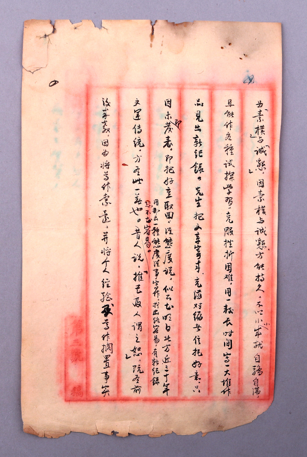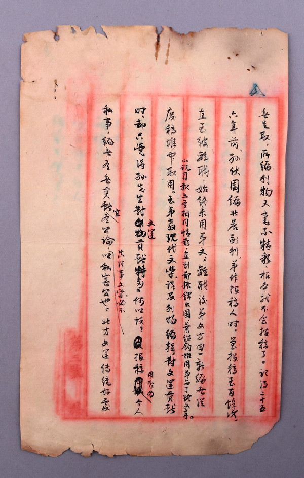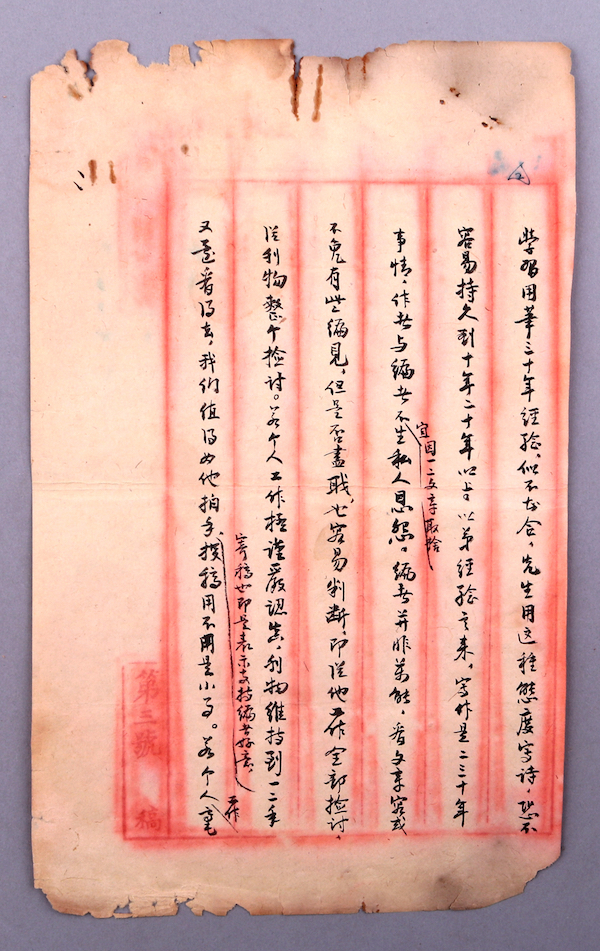 昔人说“推己及人谓之恕”,既有前后来教,因为将尊作索还,并将个人经验、及尊作搁置事实奉告。当时以为尊作定可用,故曾将文字不清楚处(恐排时弄错误之字)旁加注明,将尊作涂脏,很抱歉。