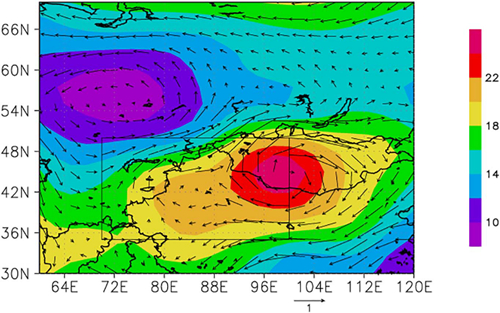 图2.1996年-2016年和1960年-1995年天山山区500hPa风场分布差异(矩形区域为天山山区)