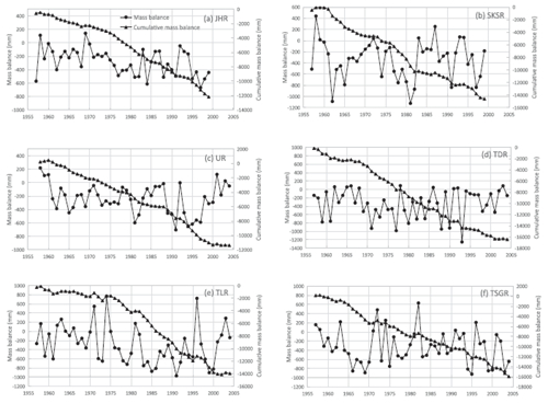 图3.天山山区不同流域冰川物质平衡变化。(a)-(f)分别为精河、四棵树流域、乌河、头道河、台兰河、托什干河。