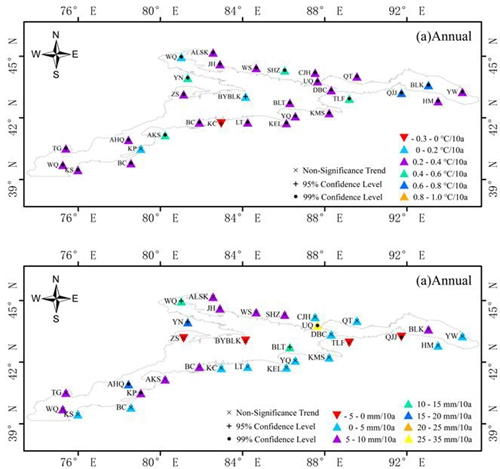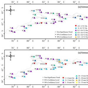 图1.1960年-2016年天山山区气温和降水变化趋势空间分布