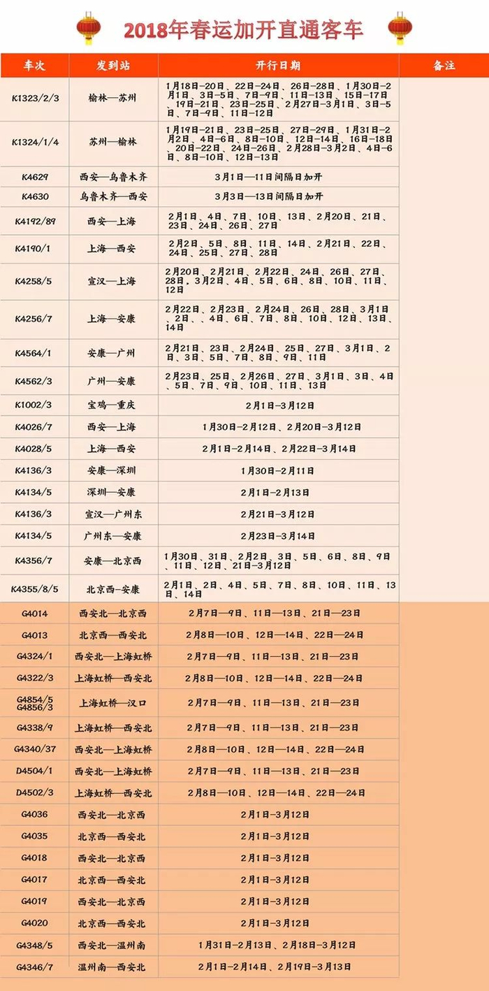 作为春运交通运输的主力,2018年春运期间,西安铁路局在节前、节后等出行高峰期加开了多趟旅客列车。具体列车加开方案如下: