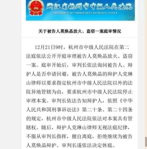 1月12日,杭州中院官微发布消息称,被告人莫焕晶经过考虑后,于1月9日向杭州中院表示,其本人愿意接受杭州市法律援助中心指派的两名法律援助律师继续担任其辩护人。