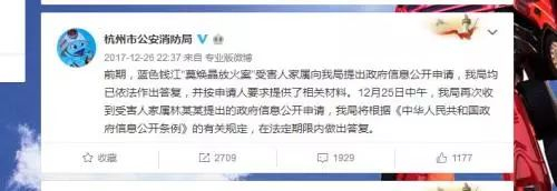 杭州市公安消防局官微12月26日发布消息称,将根据《中华人民共和国政府信息公开条例》的有关规定,在法定期限内做出答复。