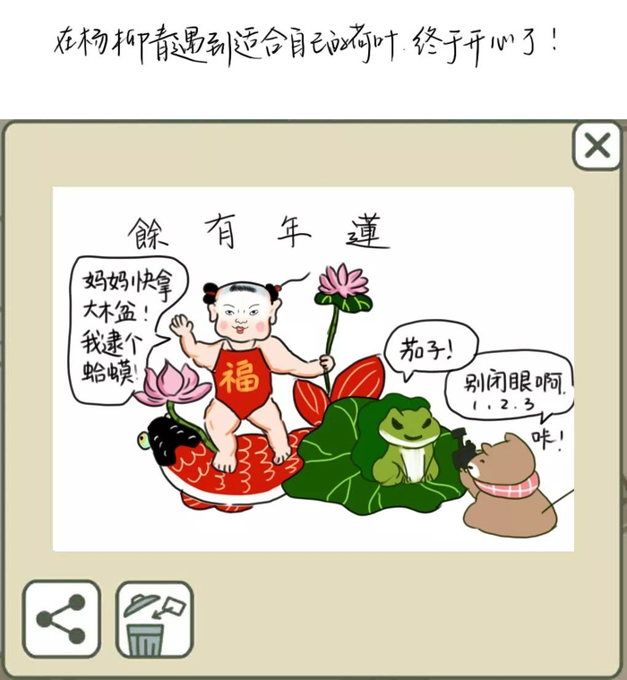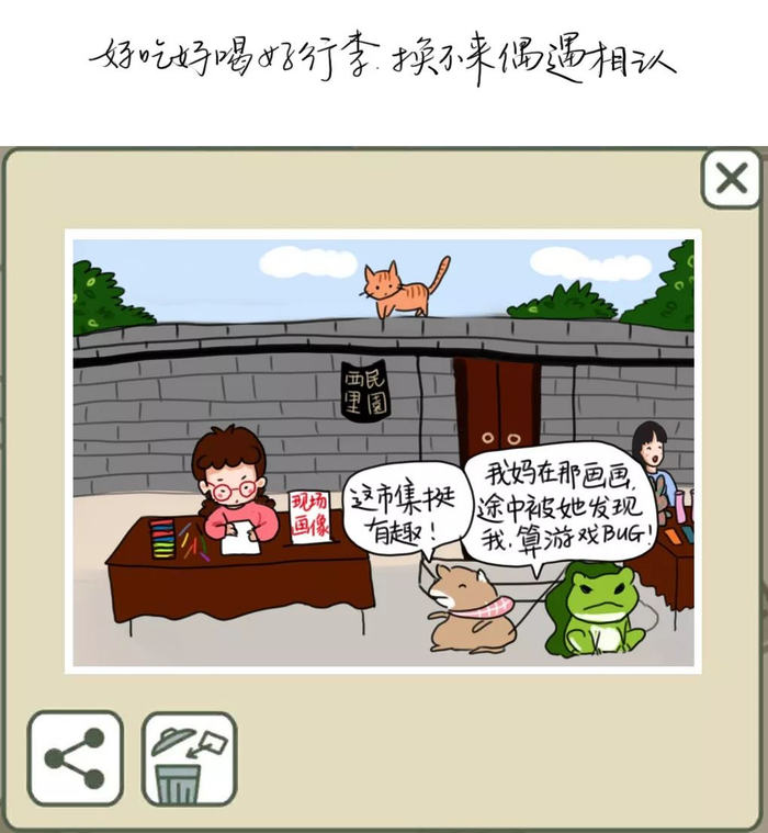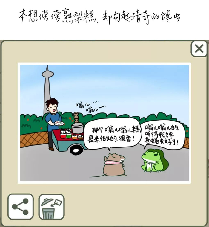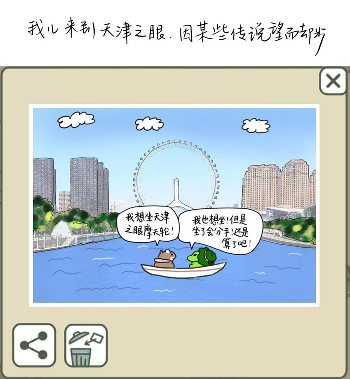 让宅姑姑没有想到的是,自己刚刚发出漫画不就,这组天津版旅行青蛙就火了,很多网友微博、微信留言想让天津版旅行青蛙继续下去,“我也会考虑的,让天津版旅行青蛙继续在天津旅行下去。”