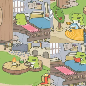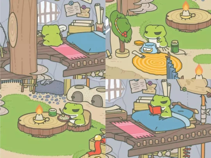 今天的主角就是它了,最近潮红的旅行青蛙。在家时完全是“乖宝宝”的姿态:吃饭、读书、削铅笔、写东西……忙碌中透露着淡定。