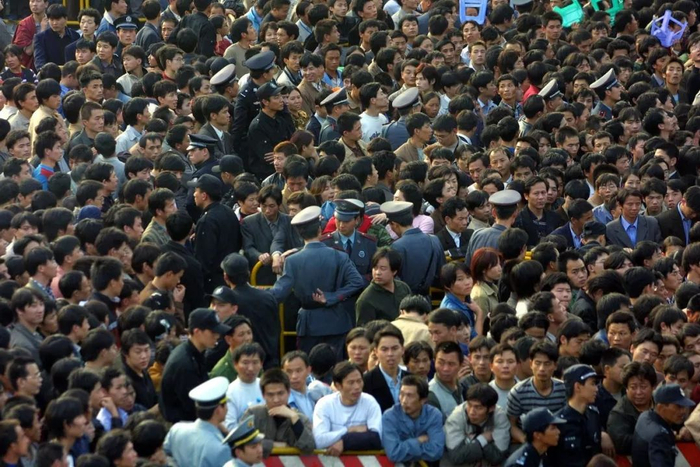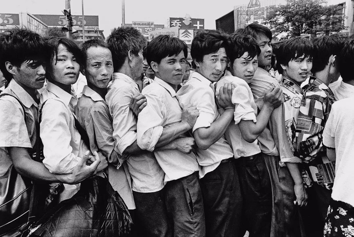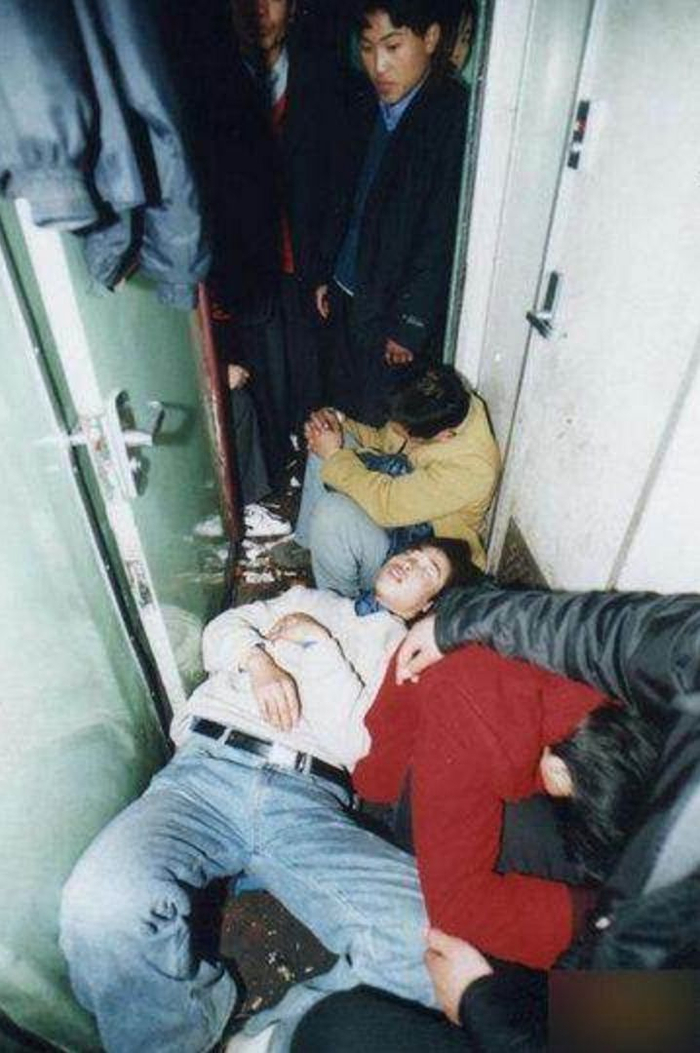 △2001年,在拥挤的列车上,累了的乘客在过道上酣睡。