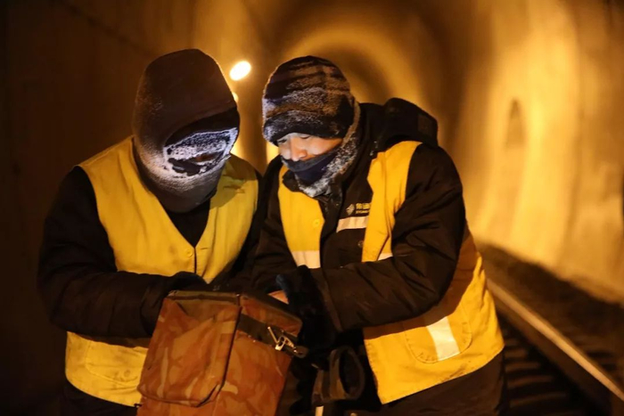 △2018年1月24日,内蒙古锡林郭勒。两名探伤工放慢速度,仔细对钢轨进行探伤。