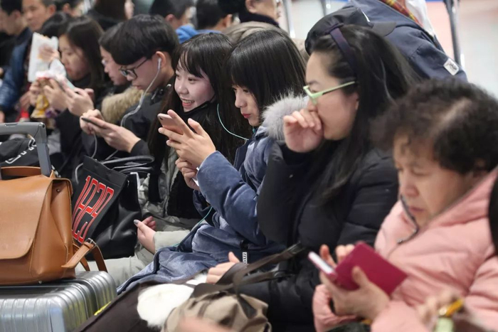 △2018年1月17日,济南火车站,专注着看手机的“低头族”成为春节回家路上的一道风景。
