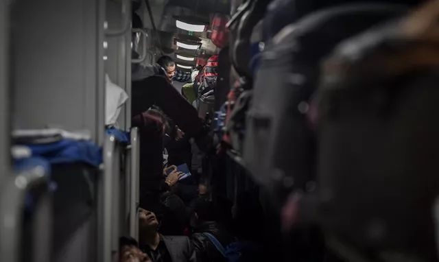 火车上正在整理行李的人们,这大包小包中的每件东西都是“宝贝”,有给家里老人孩子买的衣服,有给他们带的好吃的,总之所有的思念和感激都装在了这大包小包里。