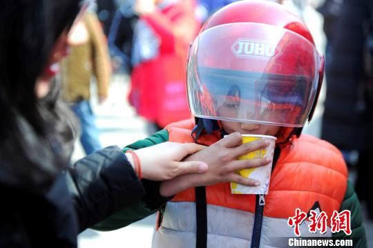 一名在梧州东出口春运服务站休息的儿童喝着工作人员提供的姜汤。 蒋雪林 摄