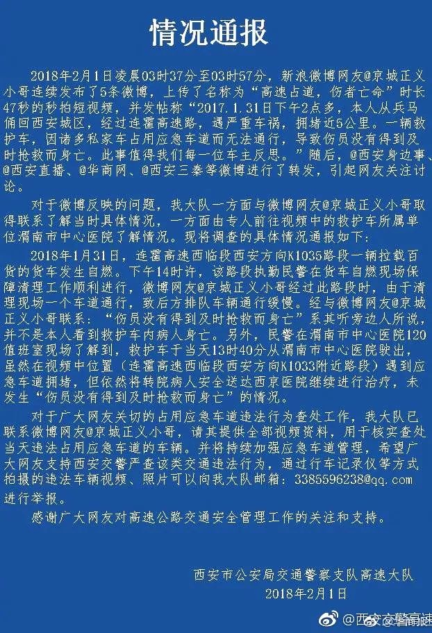 今日下午,根据网友提供的线索,西安交警高速大队调查后发表最新通报:经核实,病人没有身亡,已及时送医。交警将根据网友所拍视频,对占道车辆进行处罚。