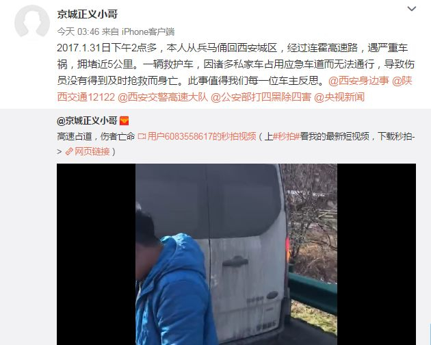 今日凌晨,网友@京城正义小哥 爆料称:“昨日从兵马俑回西安城区,经连霍高速路,遇车祸,拥堵5公里。一救护车因诸多私家车占用应急车道而无法通行,致伤员没有得到及时抢救而身亡……”