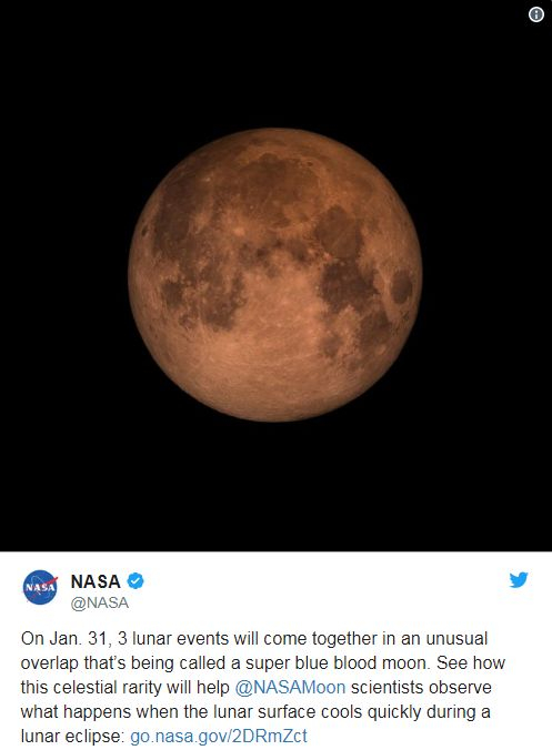 ▲美国国家航空航天局发布的超级红月亮照片