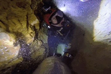 近日,探险队员罗伯特·施米特内尔来到萨克阿克顿洞穴,潜水穿行在钟乳石之间。近6小时后,他“意外”发现一处裂隙涌出大股水流。