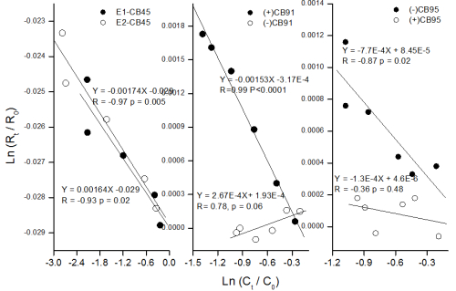 研究发现,7种手性PCB单体中,PCB45、91、95存在明显的手性组成变化,表明这3种单体存在手性选择性的代谢过程。对每种手性单体的稳定碳同位素组成的测定结果表明,PCB45的两种手性异构体的稳定碳同位素均发生了分馏效应,且两种异构体的分馏系数基本相同。这表明,PCB45的两种异构体均参与了代谢过程,并且具有相同的代谢机制,导致手性组成变化的原因可能是在底物与酶结合的过程中存在手性选择性,使得两种异构体参与反应的速度存在差别。PCB95和PCB91的两种手性异构体中只有一种异构体的稳定碳同位素组成发生了变化。这表明,这两种化合物手性组成发生变化的原因可能是只有一种异构体参与了代谢过程,与PCB45手性变化的机理完全不同。该研究还同时实现了对PBDE单体脱溴代谢过程的稳定同位素示踪,第一次测得了BDE153在脱溴代谢过程中的稳定碳同位素分馏系数。