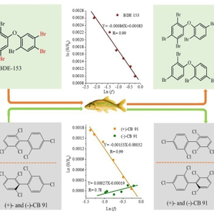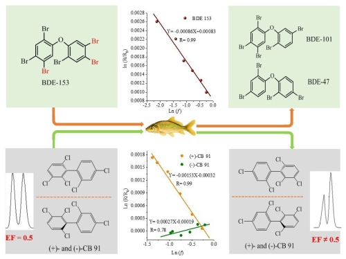 多氯联苯(PCB)是一类具有三致作用的持久性有机污染物。在209种单体中,有19种单体存在着稳定的手性对应异构体。手性异构体的组成常常被用于示踪污染物的生物代谢过程,但关于手性组成变化具体机制的研究目前较少。近日,中国科学院广州地球化学研究所麦碧娴课题组博士研究生唐斌、研究员罗孝俊以鲤鱼为研究对象,利用手性单体稳定同位素技术,测定了饮食暴露条件下7种手性PCB单体(PCB45、91、95,132、149、174和183)的手性组成特征及每种手性单体的稳定碳同位素组成,对手性变化的具体机制进行了初步的探索。